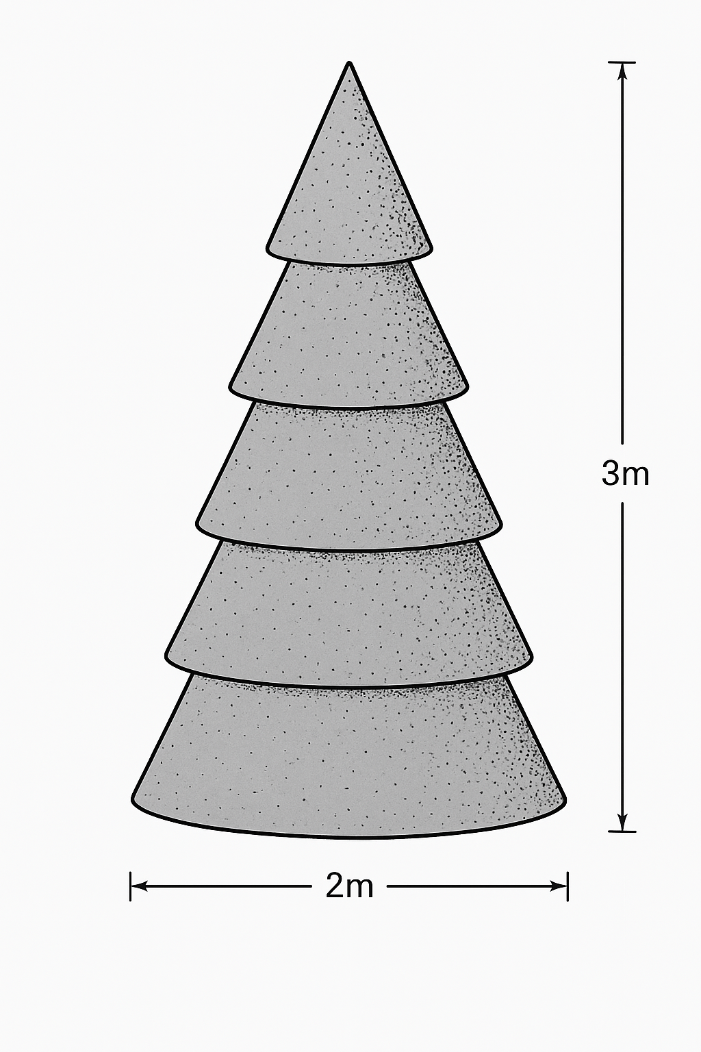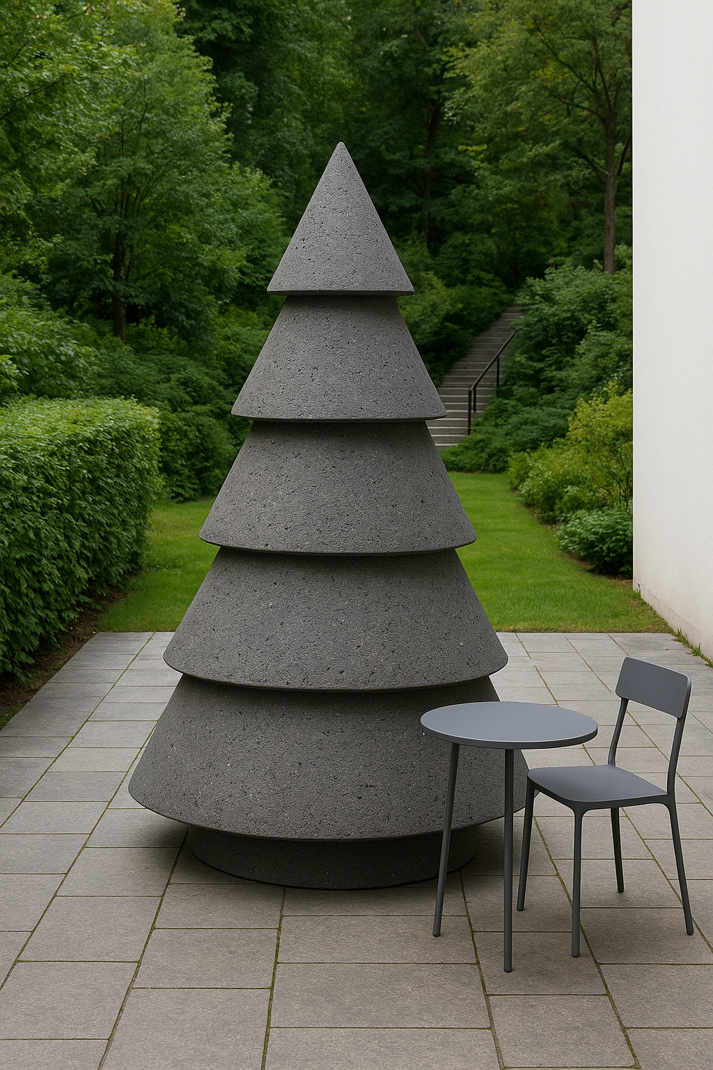 The installation represents a conical structure shaped in a primitive, “childlike” form of a Christmas tree. Its rough, gray surface resembles asphalt. The structure consists of five conical tiers.
